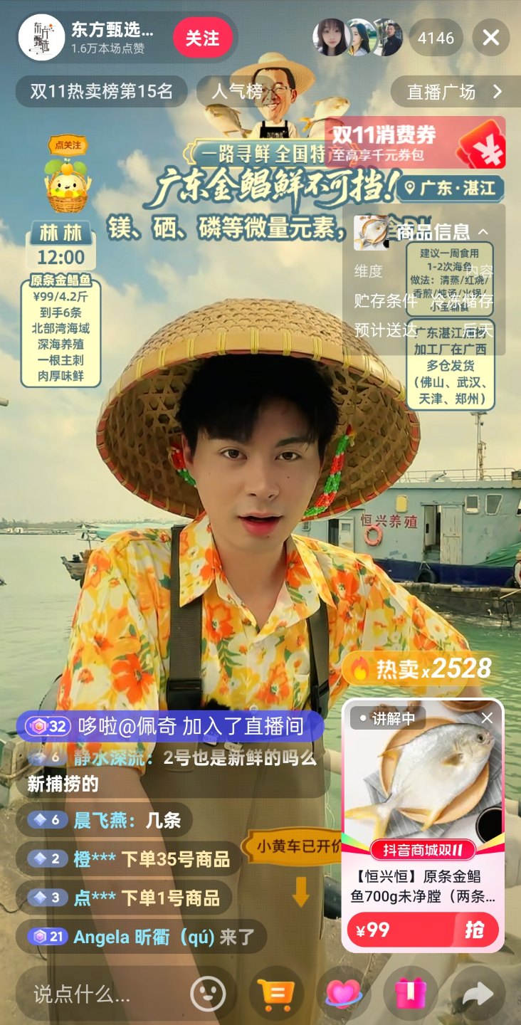 “湛江金鲳鱼,又鲜又香!3、2、1,上链接!”随着主播喊着倒计时,湛江海域的金鲳鱼通过直播间游向了全国各地的餐桌。10月11日,东方甄选在湛江开启双节后首场落地海上的直播盛盈优配,吸引了超过200万人线上观看,创下5.8万单订单量、卖出34.8万条、总销售额超600万元的亮眼成绩。这场没有明星大咖助阵的直播之所以成功,凭借的正是广东金鲳鱼的品质魅力。